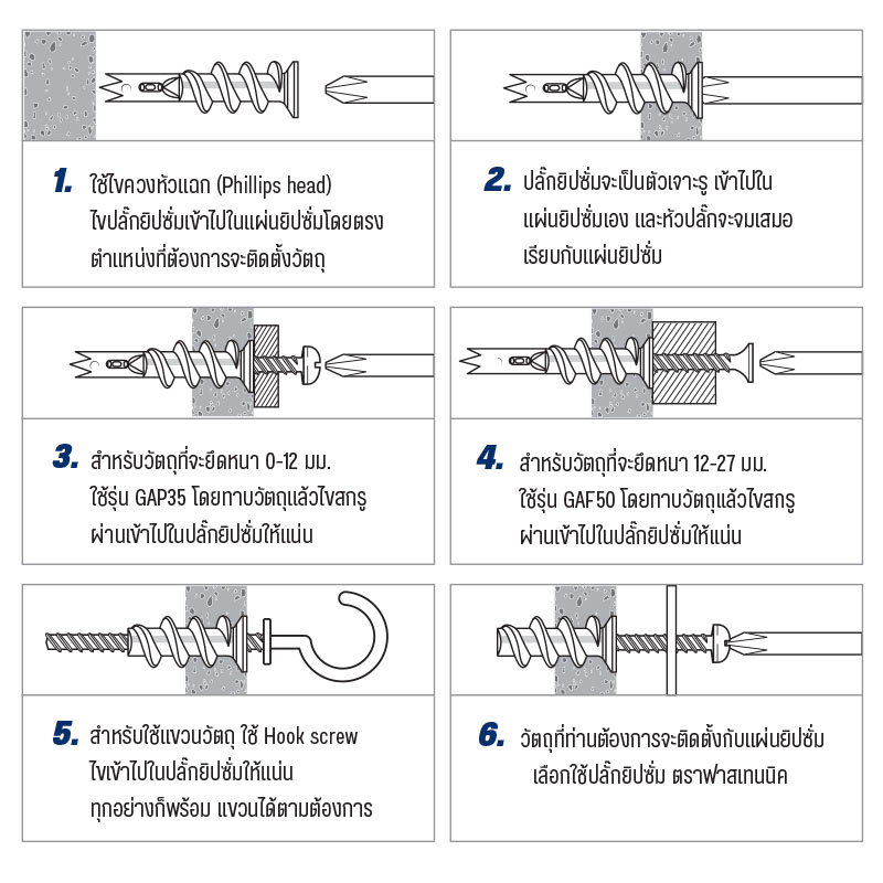 - Use only a Phillips head scewdriver and then lightly screw Gypsum Anchor directly into the gypsum board where anchor is to be fixed.