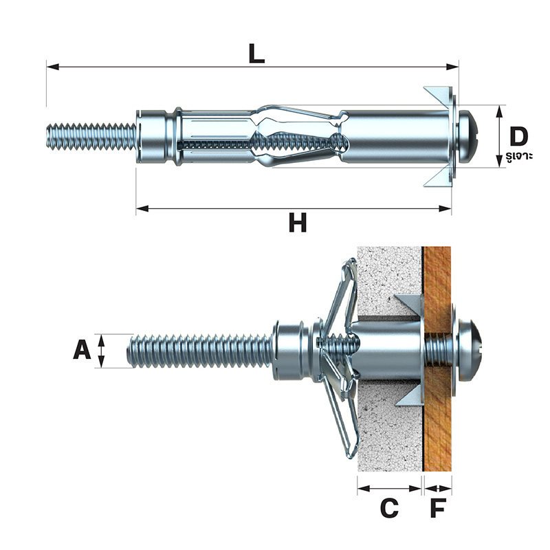 | SKU | Thread Size | Anchor Length (mm.) | D (mm.) | H (mm.) | C (mm.) | A (mm.) | F (mm.) | Pull-out (kN) | Shear (kN) |