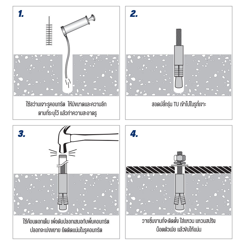 | SKU | Thread Size | Anchor Length (mm.) | Drill Size (mm.) | Drill Hole Depth (mm.) | Pull-Out (kN) | Shear (kN) |