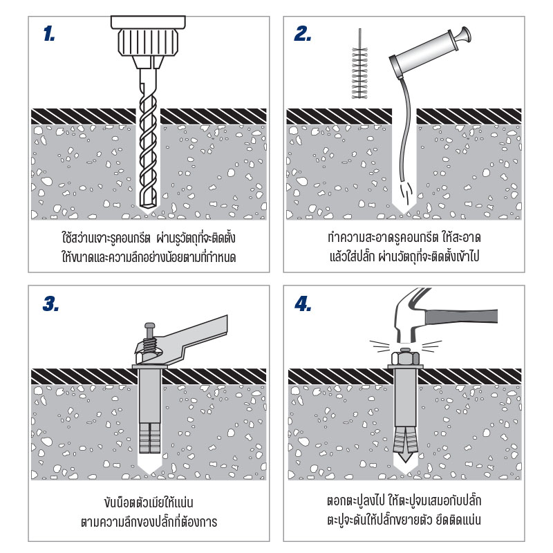 | รหัสสินค้า | ขนาดเกลียว | ความยาว (mm.) | ขนาดรูคอนกรีต (mm.) | ความลึกรูคอนกรีต (mm.) | แรงดึง (kN) | แรงเฉือน (kN) |
